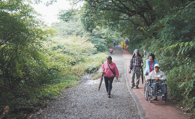 為讓身障者也有機會爬山,陽明山國家公園管理處早在91年7月起,即在陽明山開闢「二子坪無障礙步道」,吸引不少輪椅族、行動不便長者爬山,甚至還有新手媽媽會推著嬰兒車一塊來踏青。