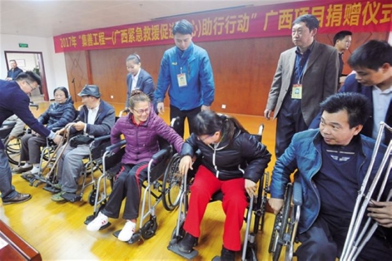據介紹,“集善工程——(廣西緊急救援促進中心)助行行動”項目是中國殘疾人福利基金會與廣西緊急救援促進中心共同開展的助殘項目,由廣西緊急救援促進中心向中國殘疾人福利基金會捐贈價值56萬元的普通輪椅1000輛,這批輪椅全部資助廣西。這1000輛輪椅將惠及南寧、梧州、北海市等7個市、縣的肢體殘疾人,重度、貧困、持有第二代中華人民共和國殘疾人證、近3年來未得到過輪椅資助的肢體殘疾人朋友將優先獲得輪椅資助。