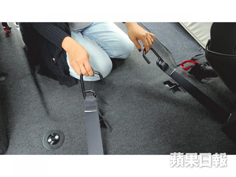 大部份福祉私家車的設計,往往是車本身某一張座椅變成輪椅,輪椅有電動升降並可獨立使用。而NV200是於尾箱改裝加設一些裝置,例如伸縮尾板、電索及扶手等,方便用家將自己的輪椅推上車。為了測試實用性及使用時的方便程度,找來記者阿俊扮爸爸,我嘗試一個女仔推「爸爸」上車,又看看需時多久。其實步驟不算太複雜,學一次已可以掌握,首先撥一撥尾門檻的手掣解鎖才可放下斜台板,斜台板可以負重200公斤。接着是收摺中排椅,拿走頭枕,再拉一拉椅背上方的黑帶摺合椅背,然後拉椅子下方的兩條紅帶抽起座椅。日本人設計十分細心,除了椅子有位置可以收納頭枕,更有椅套遮蓋,令變身後空間相當整潔。尾箱左邊有一個黑盒,用來控制四條鋼索,此時可以將爸爸推到斜台板末端,按一下鋼索盒的「拉出」掣,然後拉出兩條前方鋼索扣到輪椅前方柱位。準備推爸爸上斜台板前,按一下鋼索盒的「進入」掣,這兩條鋼索作用是如果不夠力推輪椅上斜時,鋼索會幫你拉實輪椅,於斜台中段鬆手也不會溜後。輪椅完全進入車廂後,按鋼索盒的「解開」掣,拉起兩條鋼索扣實輪椅後方柱位,扣好後按「收緊」掣索實輪椅。最後爸爸扣上兩條安全帶便大功告成,結果用了2分40幾秒,不用3分鐘便完成送爸爸上車,過程算快捷。