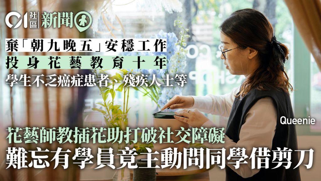 Queenie的學生中,有不少是癌症患者、康復者,也有肢體、智力上輕度傷殘的人士。她表示,一次偶然之下她參加義工活動,接觸到這些不同的社區機構,自此便開始為這些機構擔任義務導師,希望讓更多社區基層人士能夠體會插花的樂趣,融合花藝與生活,從而平衡心靈及自我療癒。她指,起初也要與機構職員、社工不斷協調,為有不同能力水平的學員制定合適的課程內容,並要兼顧安全、技能水平和學習的難度,其中也見到學員學習花藝後的轉變。