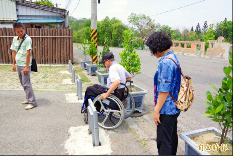 嘉縣脊髓損傷者協會常務理事吳滿足、監事陳良榮昨坐輪椅實勘,發現車阻與盆栽的間距八十多公分至一百四十公分,電動輪椅出入,先得閃避水溝蓋的間隙,避免「卡輪」,通過盆栽即遇到車阻擋路,需左右旋轉才得其門而入。