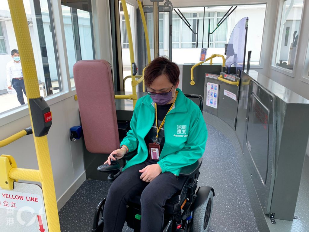 中心另設有模擬巴士訓練,戶外巴士是由貨櫃改裝而成,外型及內部設計都是以真實巴士一比一的比例組成,但輪椅需要經過的通道加闊了,目的是讓患者先熟習,繼而能盡快融入日常生活。復康中心會為電動輪椅人士評估配置及訓練,包括6堂技能提升小組訓練,之後亦會包辦管理及維修電動輪椅的工作,為患者重整生活。