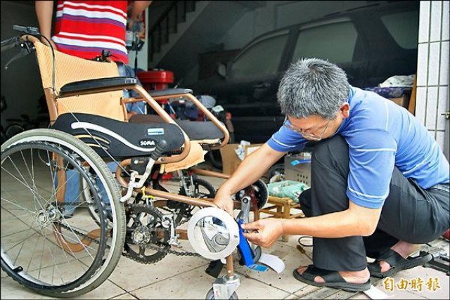 吳昆益說,設計圖出爐,逐一詢問電動機車協力廠商,不是得到做不出來,就是需要另外開模特製,需斥資千萬元,乾脆自己動手做,三個月來只要下班就逛五金行找零件,只有齒盤請師傅特製,其他全是自己DIY,廠商開價上千萬得特製輪椅,自己只花六千元材料費,改裝一般輪椅就完成。
